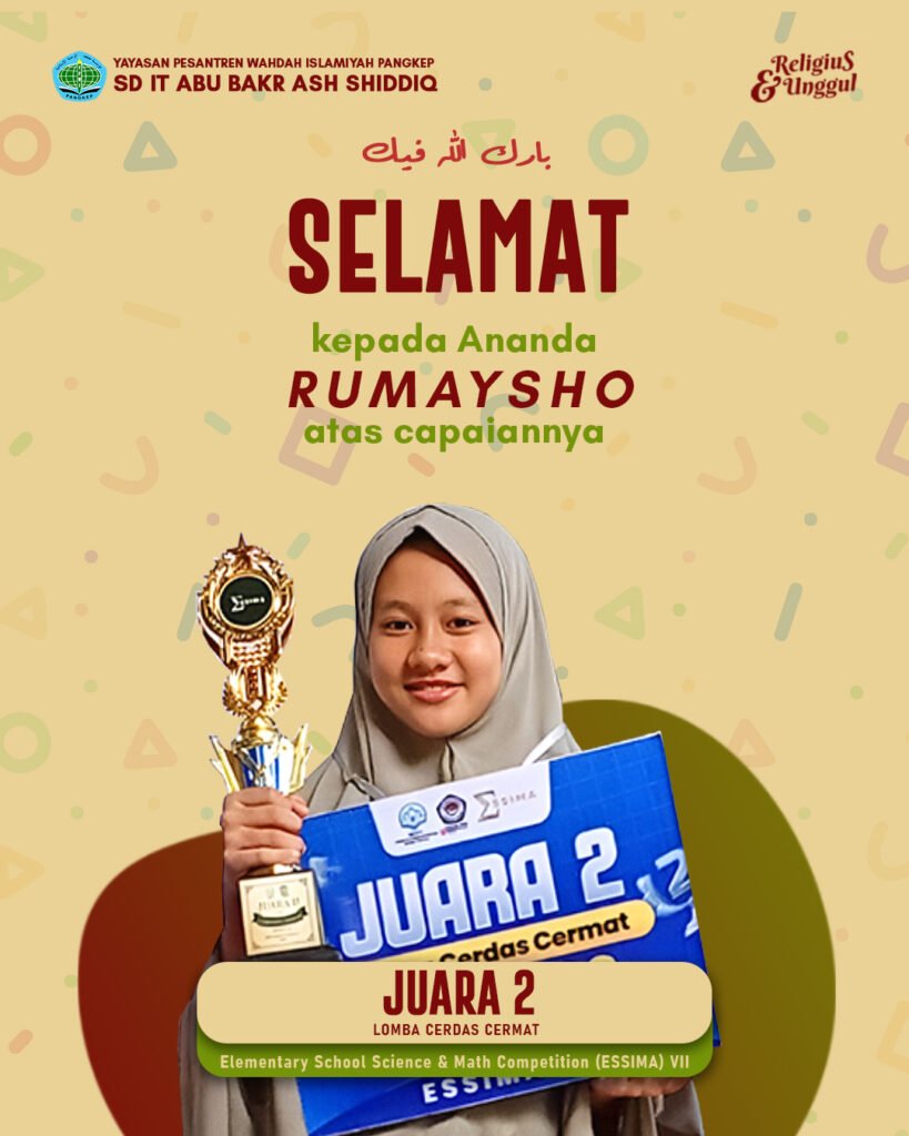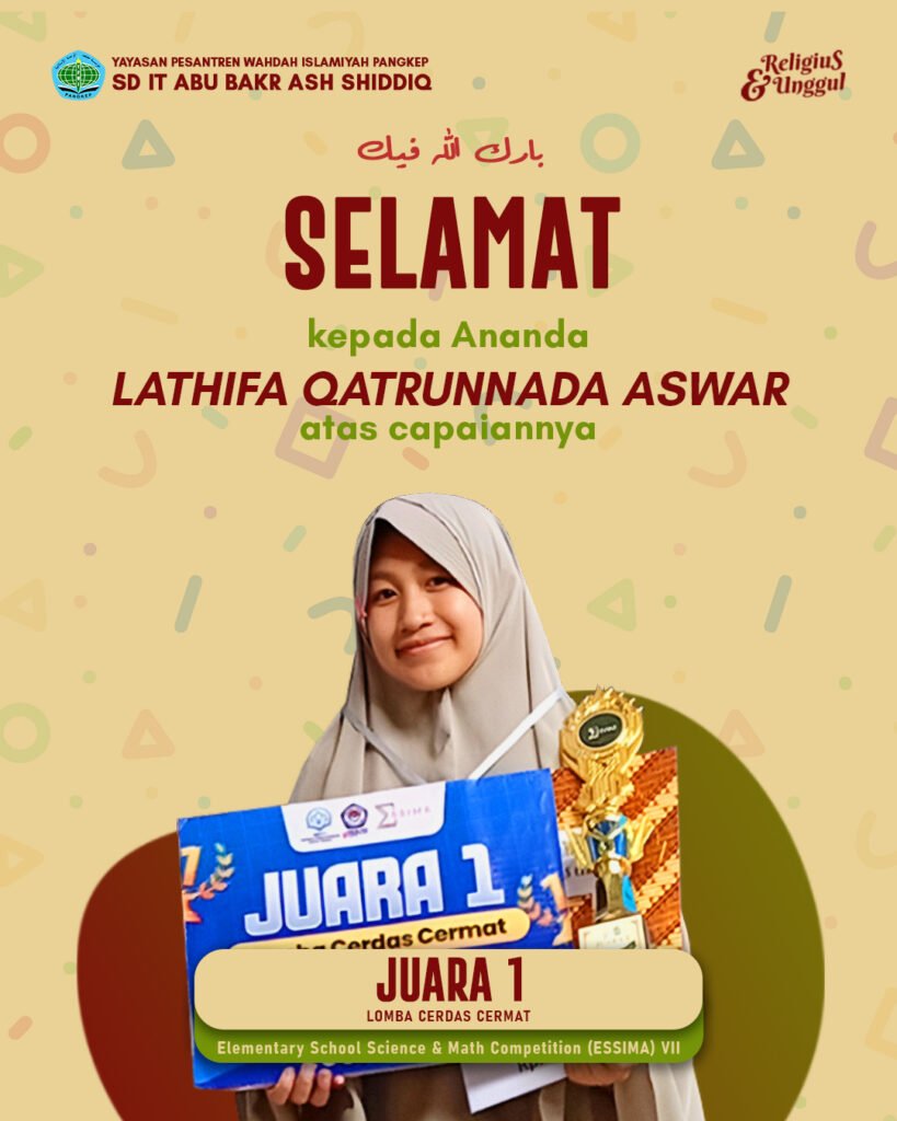 SDIT Abu Bakr Ash Shiddiq, Pangkep - dua orang siswi SDIT Abu Bakr Ash Shiddiq berhasil menyabet juara 1 dan 2 pada ajang Elementary School Science & Math Competition (ESSIMA) VII. Ajang lomba ini diadakan oleh SMPS Tonasa II di Biring Ere, Pangkep pada Rabu, 11 Februari 2026. ESSIMA VII mengadu kemampuan siswa SD se-Pangkep dalam tiga cabang lomba. Ada total sembilan orang siswa SDIT Abu Bakr Ash Shiddiq yang turut berpartisipasi. Adapun kedua siswa yang berhasil menjadi juara satu dan dua cerdas cermat adalah Lathifah Qatrunnada Aswar dan Rumaysho.
